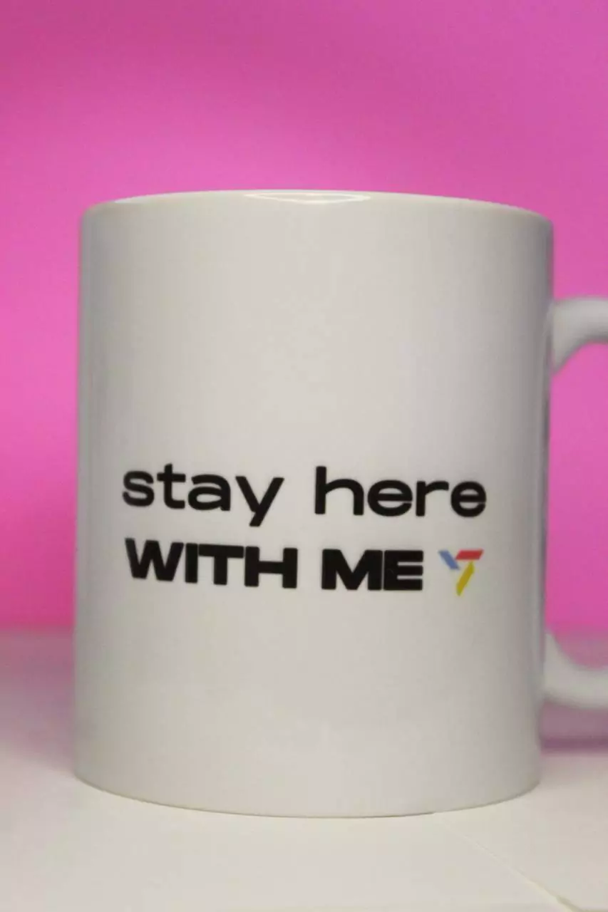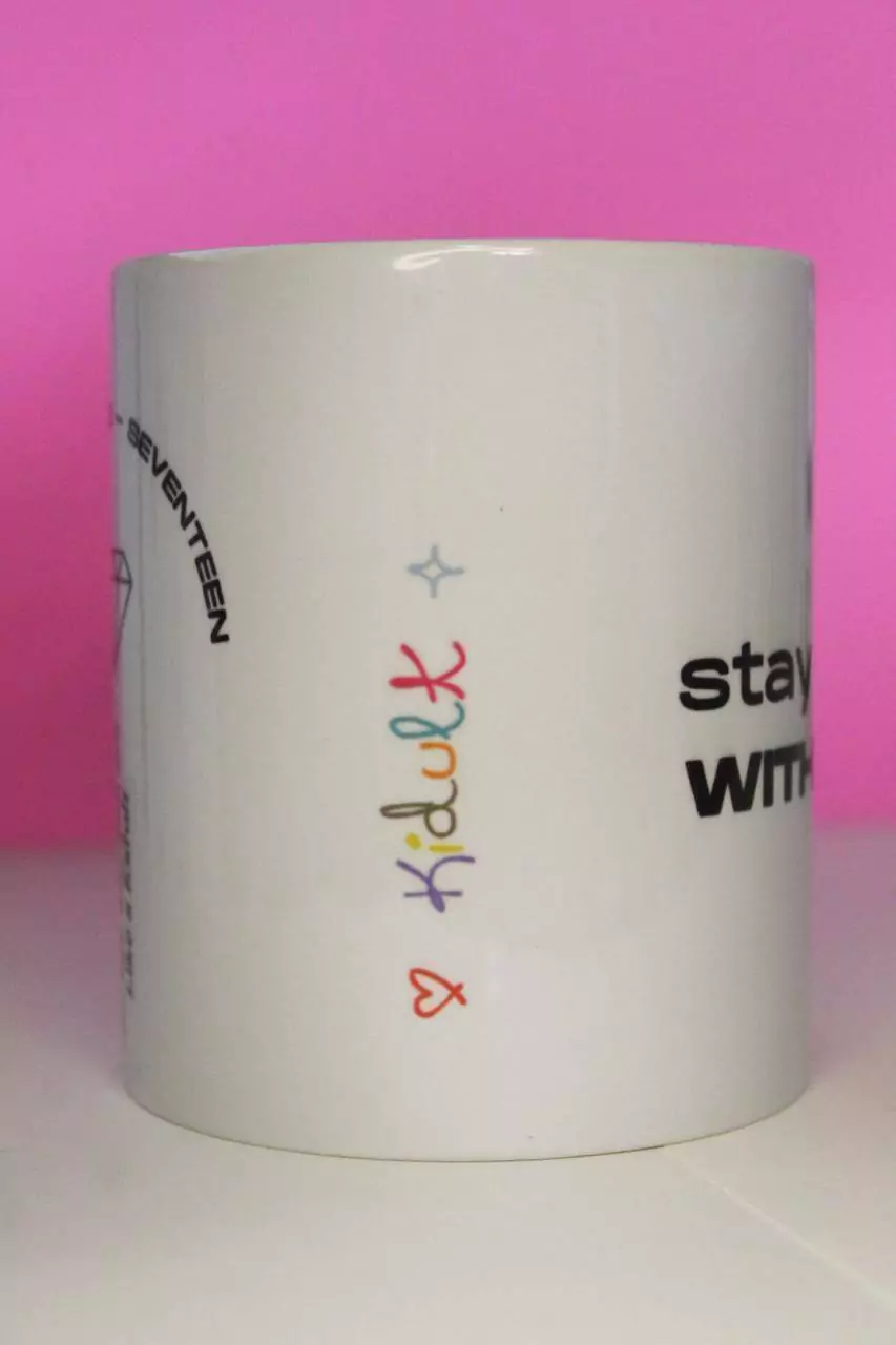 Na primeira parte da estampa tempos a frase stay here with me, que faz parte do refrão tendo tradução livre como fique aqui comigo seguida pelo logo do grupo nas cores amarelo, azul e rosa. Apesar de trazer uma estampa mais adulta buscamos trazer uma referência ao lado kid de kidult, e ele está estampado na lateral com letras coloridas com desenhos infantis. Nas costas da caneca temos a estampa fazendo referência a caratbong, seguindo o seu design, tendo no topo say the name seventeen e um diamante abaixo e tendo no seu suporte a frase: so lets be together, just the way you are, like a kidult, vamos ficar juntos, do jeito que você é, como uma criança adulta.