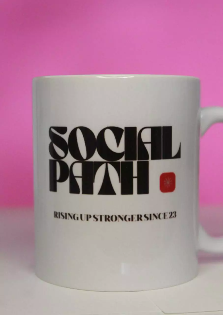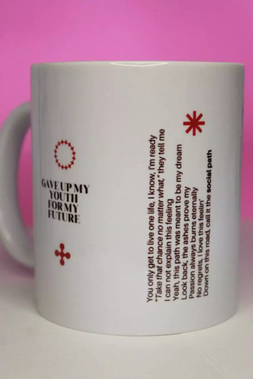 Nossa caneca Social Path. Na frente dela temos em destaque o título da música Social Path, logo abaixo: rising stronger since 23, fazendo referência a letra da música. Ao lado temos o refrão que traz tanta força e coragem nos seus versos. Ao final temos a referência de gave up my youth for my future que apesar de ser uma referência direta aos tempos de trainees do grupo, foi eternizado na letra por Chan de forma que faz com que a gente sinta que foi escrito exatamente para a gente, lembrando de todas as coisas que nós sacrificamos hoje pensando no nosso futuro.