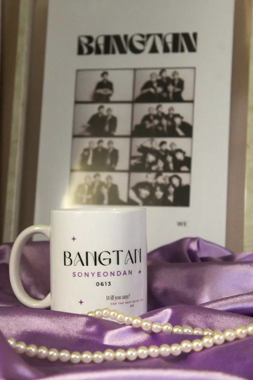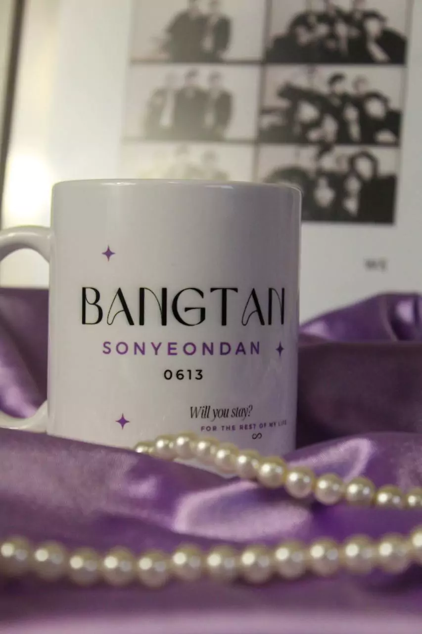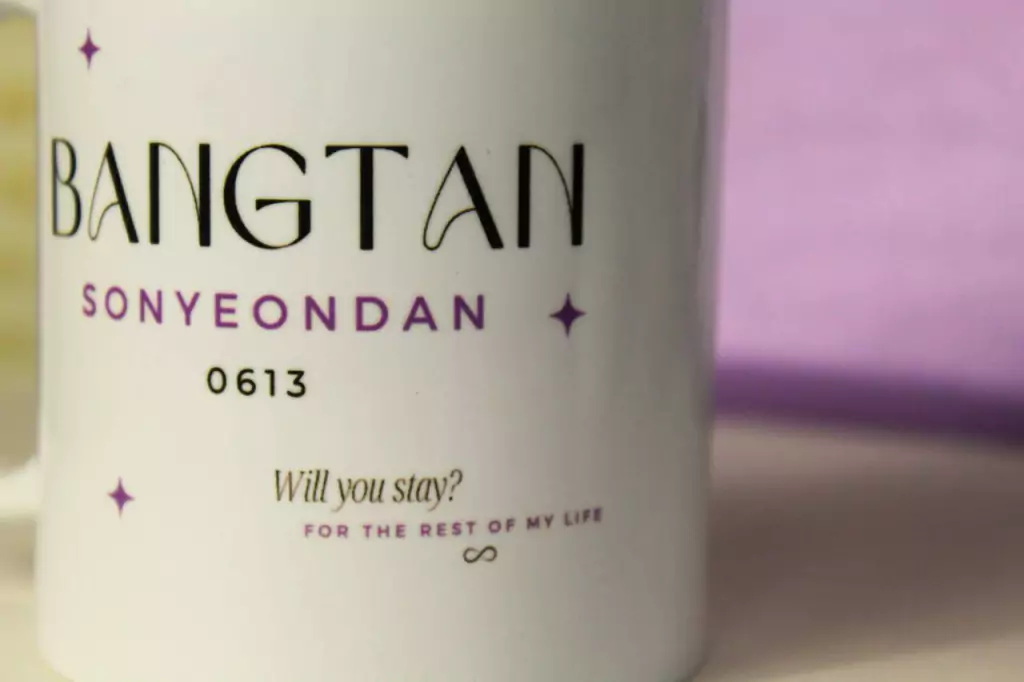 O detalhe afetivo dessa estampa é a escolha de trazer a pergunta e a resposta que está presente nas músicas take two e for youth. A primeira frase de Take Two é Will you stay ? Que é uma pergunta pro army: você vai ficar ? E respondemos ela na caneca através da última frase cantada em For youth: For the rest of my life, traduzido como para o resto da minha vida., seguido de um símbolo do infinito.