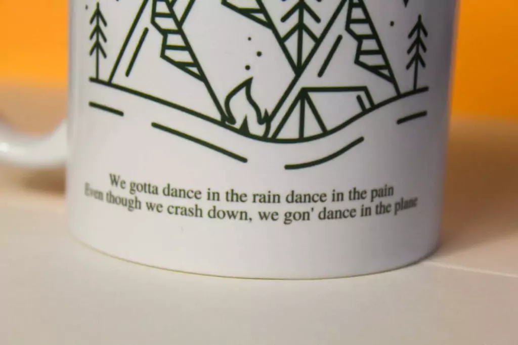 Na outra estampa temos a referência a Moonchild: " We gotta dance in the rain, dance in the pain. Even tought we crash down, we gon' dance in the plane." Com tradução de: Nós devemos dançar na chuva, dançar na dor. Mesmo que a gente desabe, nós vamos dançar no avião." Acima temos a palavra moonchild e o seu desenho tem inspiração na obra de Tolkien, o que é mais um dos segredinhos do clube secreto das Rkivers.