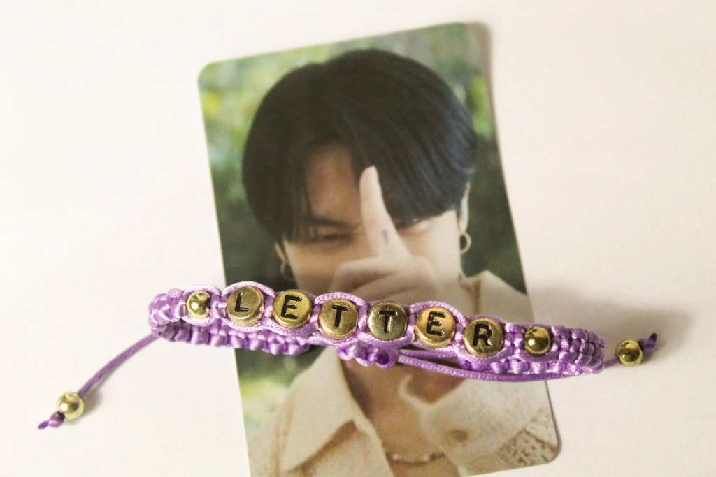 Inspirada no presente do army feito pelo Jimin, a pulseira letter tem fio de cetim lilás com entremeio dourado.