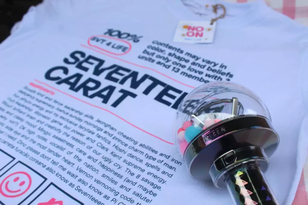 Nossa Tee Label x SEVENTEEN CARAT faz parte da nossa linha K-pop Label, que busca trazer como uma etiqueta referências a um grupo e seu fandom e é um item da coleção comemorativa de aniversário de debut do Seventeen e NOON: a NOONTEEN. A versão SEVENTEEN CARAT tem na sua estampa as cores azul marinho e rosa neon.
