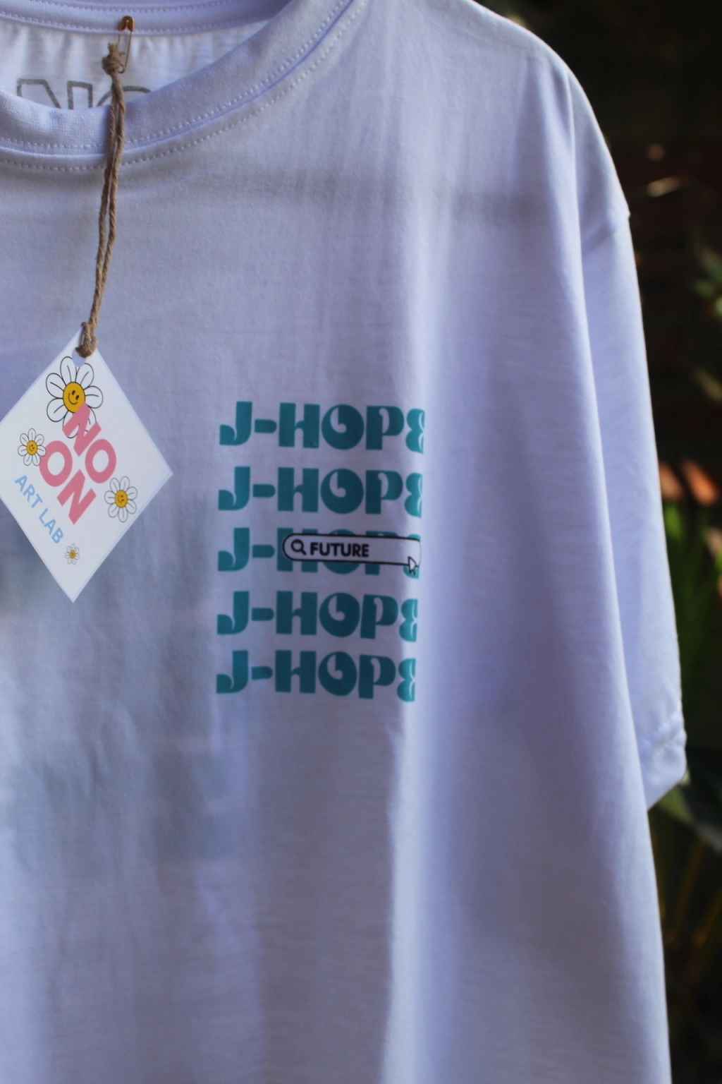 A paleta de cores dessa camisa segue as cores predominantes do look usado pelo Hobi na apresentação de Future no Lollapalooza: branco, azul e preto. Na parte da frente da estampa, temos cinco vezes Jhope repetido, fazendo referência aos 4 singles já lançados por Hobi (CNS 2019, Blue side 2021, More 2022 e On The street 2023) + o Jhope do futuro, de Future, que está localizado ainda com uma caixinha de busca do Google com a palavra Future.