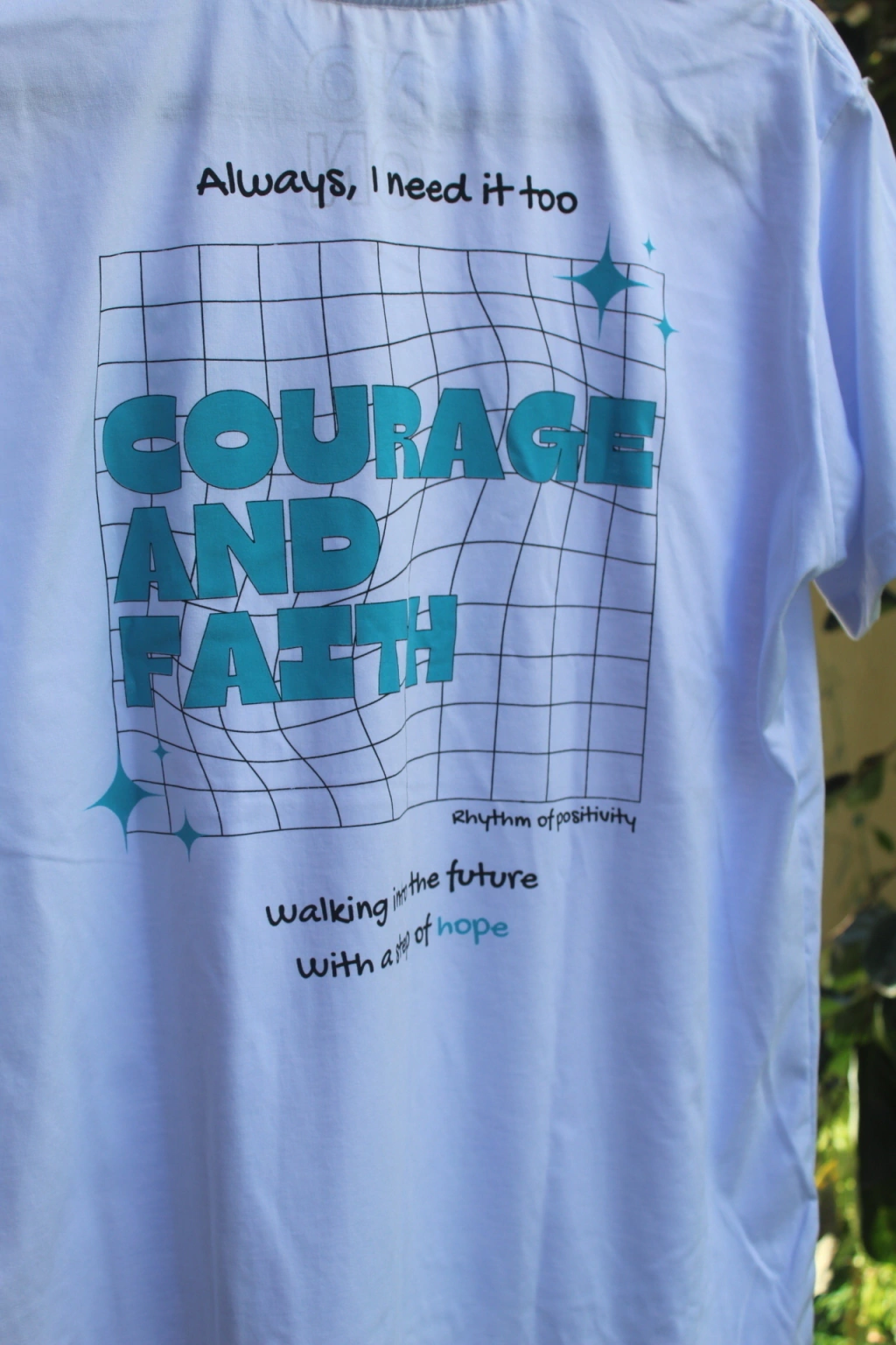 Na estampa das costas temos uma ilustração que traz referências futurísticas com toques fofos trazendo trechos importantes da letra de future, como o refrão: Always, I need It too. Em letras azuis e com maior destaque as palavras que são fundamentais tanto na letra quanto na nossa vida ao olhar e pensar no futuro: coragem e fé. Seguido logo após o quadrado de destaque expressão ritmo da positividade.
